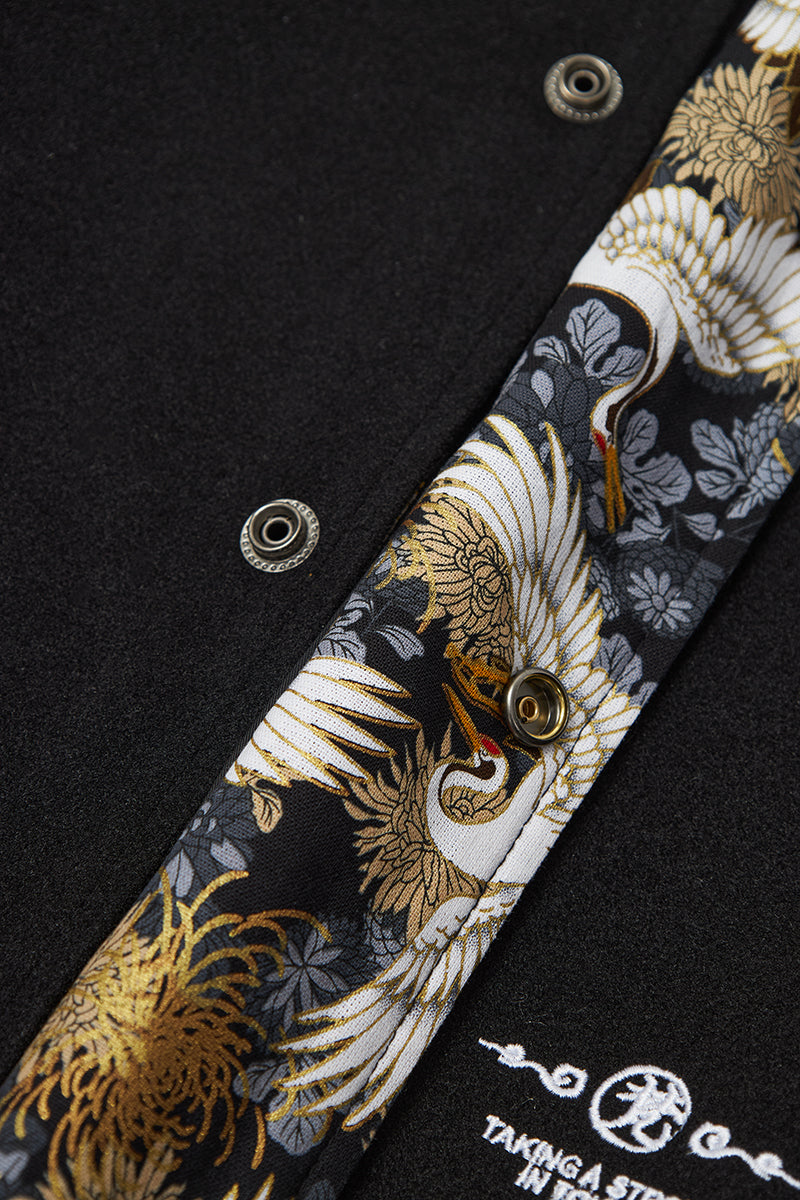 - Iconic fuzzy embroidery paired with the White Crane motif